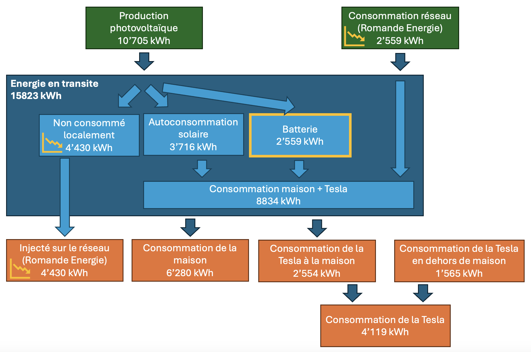 Grâce aux 12 panneaux supplémentaires, j’estime, par simulation, que ma production augmentera d’environ 3’500 kWh par an. L’autoconsommation ne devrait pas augmenter de manière significative, ce qui signifie que la quasi-totalité de cette production supplémentaire sera revendue sur le réseau. Il s’agit d’une estimation prudente, car en réalité, une partie de cette énergie sera consommée, notamment par la Tesla, qui pourra être rechargée plus rapidement.